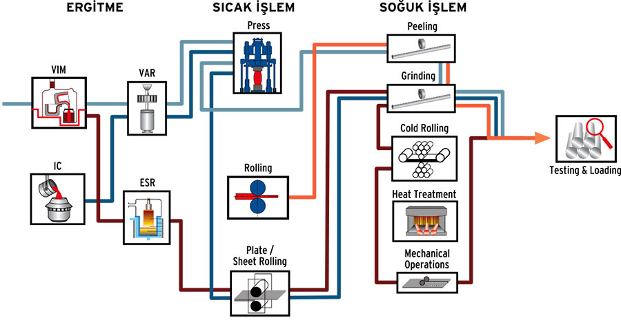 Varzene Metal üretim imkanları Sürekli Döküm, Vakum İndüksiyon Ergitme (VIM), Vakum Ark Ergitme (VAR), Açık İndüksiyon Erigtme (IF), Vakum Kap İndüksiyon Ergitme (VCAP) ve Açık Kalıpta Dövme, Isıl işlem, Haddeleme, Soğuk Çekme ve Mekanik İşlemedir.